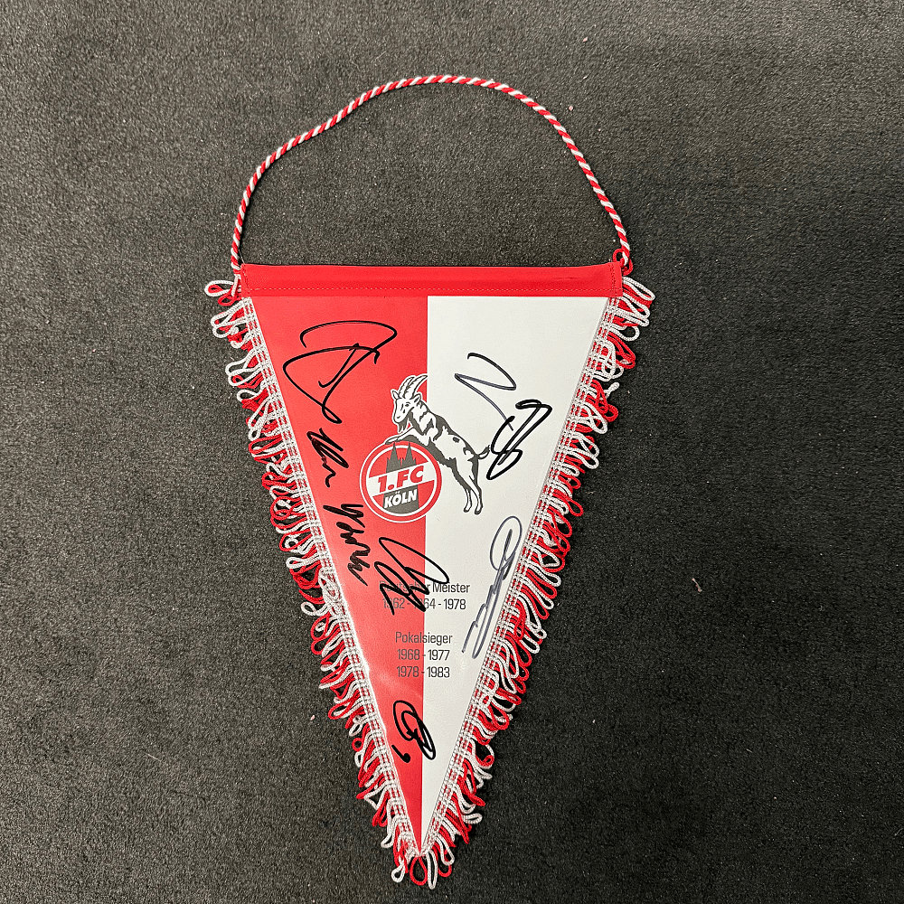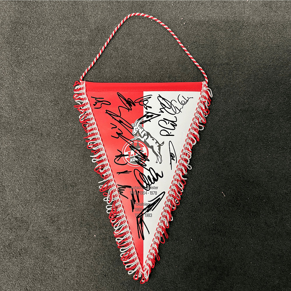 • Mannschaftssignierter Wimpel in Plastikschutzhülle, mit Fransen umnäht